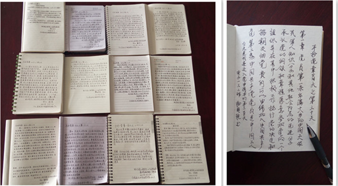 304永利集团各员工支部党员、预备党员于3月1日起开展“誊录党章,学思践悟”手抄党章100天活动,旨在深入落实“两学一做”文件精神,为建党95周年献礼。活动首先从2013级员工党支部开始,支部成员坚持每天誊录党章,并于30日晚召开专题研讨会展示手抄笔记,交流心得体会。支部副书记肖梦琪同学说:“学习党章是党员的基本要求,是党员武装自己的最好方法,通过手抄党章,加深了对党章的理解、提高了党性认识。同时也在大学期间留下了书写带来的的美好记忆。”校员工会主席董思佳同学经常在抄写党章后留下自己的感悟,她写到“作为员工会主席,我时刻严格要求自己,不忘记自己预备党员的身份。“主席主席主动学习,团干团干团结共干”员工干部不能有官僚气息,要坚持服务广大同学,维护同学利益,做好员工工作”。