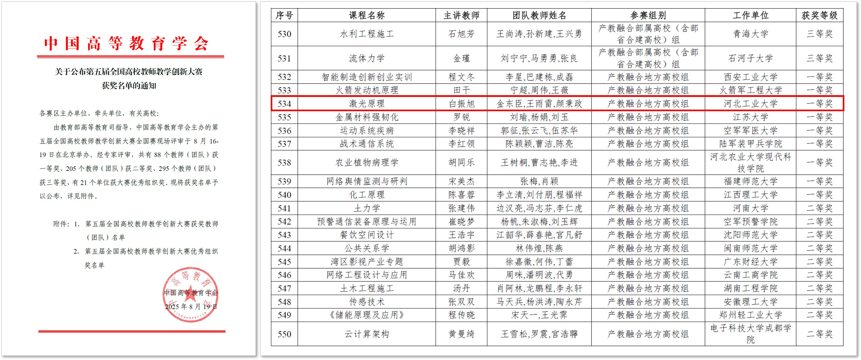 本届大赛覆盖全国32个省份、14个学科门类,吸引了1308所高校的12.7万名教师参加校赛,3.4万名教师晋级省赛,最终共有588门课程的2253名教师入围全国赛。经过专家严格评审,共评出一等奖88项、二等奖205项、三等奖295项。自校内选拔赛以来,激光原理教学团队一路过关斩将,先后斩获校赛一等奖、河北省特等奖,并最终在全国总决赛中脱颖而出。