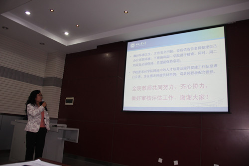 武经理强调了此次审核评估工作的指导思想,强调要“以评促建、以评促改、以评促管、评建结合、重在建设”, 突出内涵建设和特色发展 ,强化办学合理地位、强化人才培养中心地位、强化内部质量保障体系建设,最终提高人才培养质量。