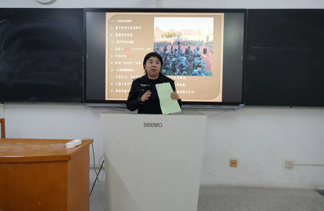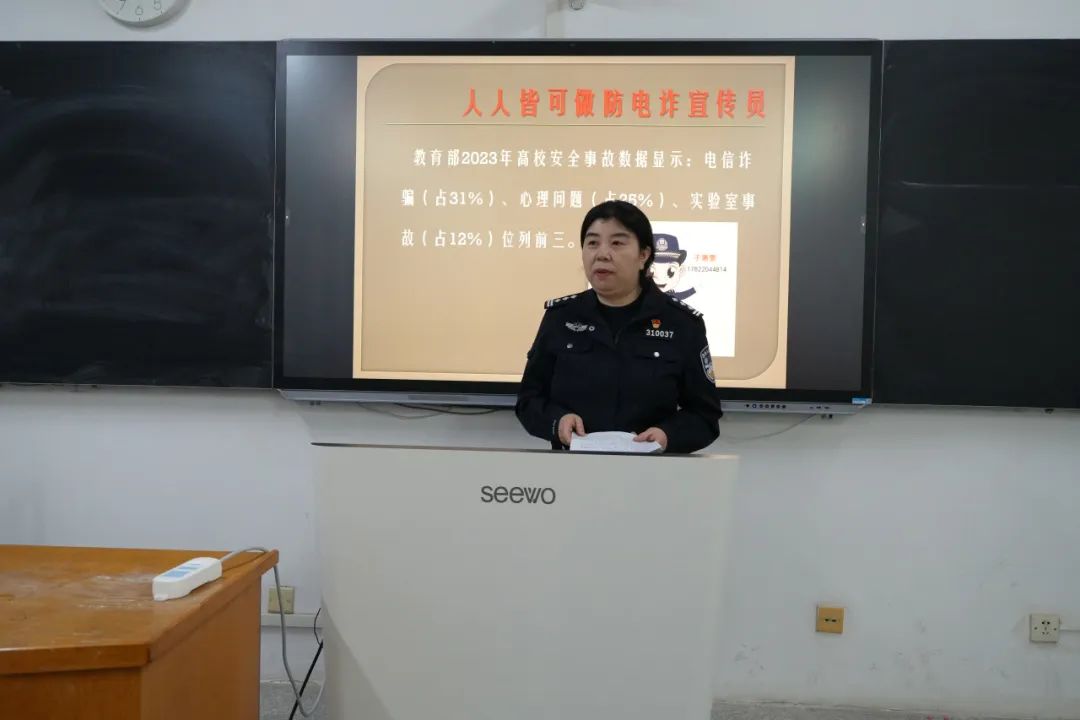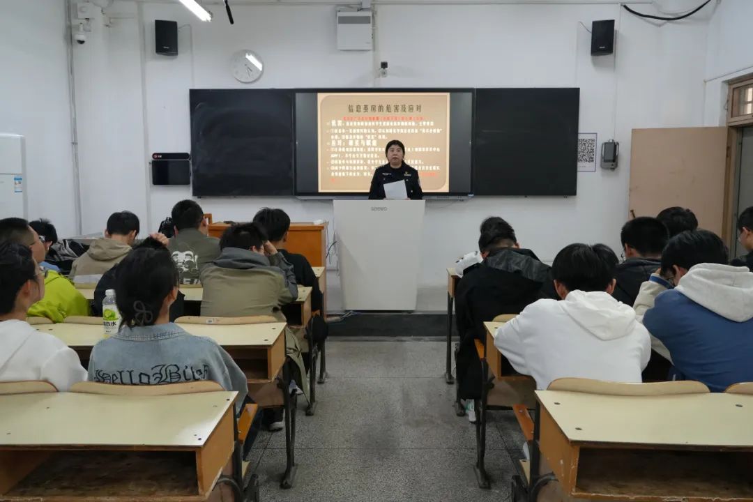 于惠雯警官围绕人身安全、财产安全、心理健康危机、网络安全、电诈传销陷阱等个关键领域,进行了深入细致的阐述讲解。在人身安全方面,于警官详细讲解了如何正确应对暴力冲突,帮助同学们掌握在危险情况下保护自己的方法;在财产安全板块,着重提醒同学们守护好个人财物,同时分享了处理网购纠纷的合理方式,引导同学们树立正确的消费观念和维权意识。
