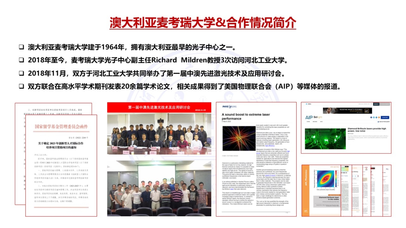 “先进高功率激光技术与装备创新国际合作项目”由公司电子科学与技术学科与澳大利亚麦考瑞大学光子研究中心开展合作,通过以国家重大科研及工程项目为牵引的人才培养模式,将国家需求、科研项目和人才培养紧密结合,以实现培养在激光技术领域具有国际化视野、专业素养突出、行业引领能力的创新型国际化人才,不断提升服务国家需求能力,并有力促进电子科学与技术学科的发展。