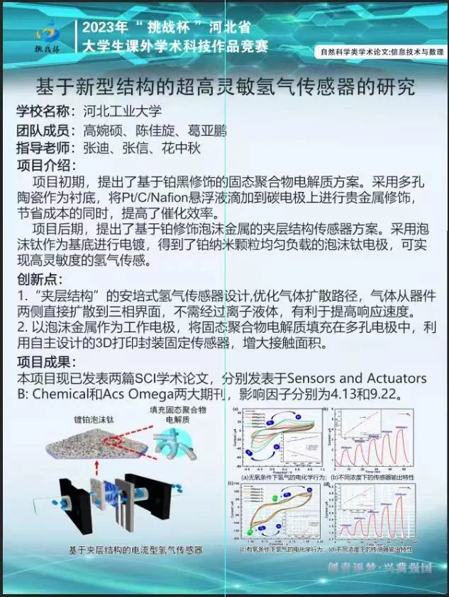 项目后期,提出了基于铂修饰泡沫金属的夹层结构传感器方案。采用泡沫钛作为基底进行电镀,得到了铂纳米颗粒均匀负载的泡沫钛电极,可实现高灵敏度的氢气传感。